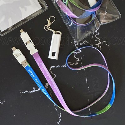 ※充電線可正面彩印企業形象LOGO設計圖,背面印刷刻度尺,支援多頭充電頭功能多多好方便。 ※出貨不含卡套請另購。 掛繩尺寸約:繩長約92CM、寬均為1.2CM 材質:ABS + 滌綸掛繩 包裝:白色封口膠袋 功能:充電+資料傳輸+OTG手機對充 充電頭:microUSB+Lightning/Type-C with OTG USB可以給:microUSB+Lightning+Type-C三種插孔充電或傳輸. OTG手機Type-C插孔可以給:microUSB+Lightning+Type-C三種插孔之間充電或傳輸. 規格:四芯,92支漆包銅,直徑:0.08 標準電流:1.5A 最大2A,電壓.電流等設計參數完全符合Apple標準 安卓Micro和蘋果Lightning充電頭是共用,一面為安卓插頭,另一面為蘋果Lightning插頭 ※關於Type-C OTG功能: 左邊USB頭處的Type-C接頭的就一定是要有TYPEC頭的手機才可以插入,然後右邊三個接頭(microUSB+Iphone5/Type-C )可以任選一個接頭插入手機,然後兩臺手機之間可以相互充電、數據傳輸,即是說左邊的一定是要TYPEC頭的手機,右邊的可以用三個接頭(microUSB+Iphone5/Type-C )的任一種。 可:Type-C Type-C 或:Type-C Micro 或:Type-C Iphone5接頭 Lightning:適用於iP5/5C/5S,6/6Plus,7/7Plus,8/8Plus,iP X/Xs Max/Xs/Xr/等Lightning介面的手機或平板. 特性: 1.四種配置接頭,可應付各種場合 2.織帶掛繩,可印上專屬LOGO 3.卡槽設計-一體成形,卡的穩不易掉落 4.柔韌吊帶-任意彎曲,親膚不勒脖子 5.接頭耐插拔 ※產品上圖文標章僅供參考,若欲使用,須取得授權 ※LOGO客製方式:掛繩充電線雙面彩印