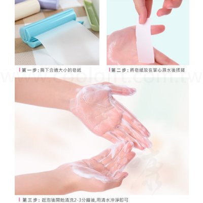 香皂紙捲尺寸:約120 x 7cm 盒子尺寸:約9 x 2.3cm 顏色:黃色-檸檬 、 粉色-玫瑰 、 紫色-薰衣草 、 綠色-綠茶 、 藍色-百合 用途:清潔手部肌膚。 使用方法:取出一片於手心搓揉,再以清水洗淨即可。