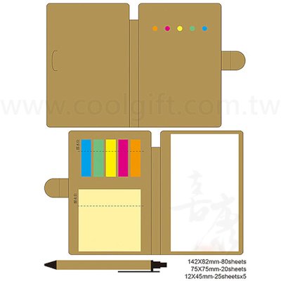 尺寸:14.5x8.5 CM 包裝:OPP袋 封面材質:300克牛皮紙便簽本,含筆 內頁均為:80克雙膠紙 內頁1尺寸:82*142MM-80張(白紙便簽) 內頁2尺寸:75*75MM-20張(黃色N次貼) PET 5彩條尺寸:4.5x1.2 CM,25x5頁 ※LOGO客製方式:封面與內頁皆可印刷 ※牛皮紙封皮彩印圖案的成品色與合成稿色差較大,印刷成品顏色會比較深色呈現。 ※因CMYK印刷方式,所以若設計圖有白色,成品即會呈現牛皮紙原色。