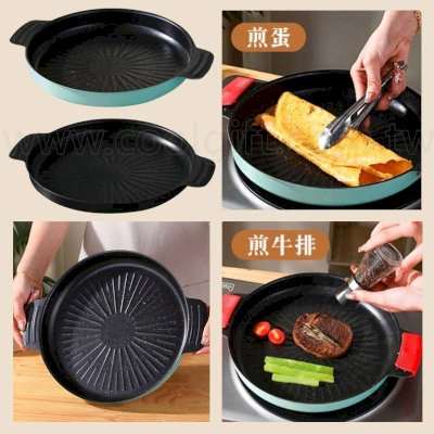 尺寸:約35.5cm(含握把)、盤徑約28xH4cm±5%(厚度約1.2cm) 材質:麥飯石塗層精鐵、防燙手把-矽膠、油刷-塑膠+矽膠、夾子-不鏽鋼 顏色:薄荷綠、原色黑 包裝:提盒 特性: 1.適用於電磁爐、陶瓷爐、瓦斯爐、電爐 2.附贈防燙手把、油刷、夾子及收納袋