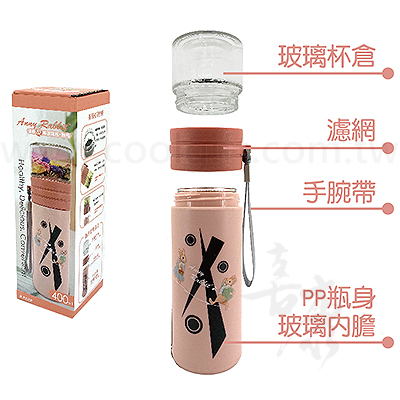 材質: 瓶身-PP 內膽-玻璃 尺寸:直徑7x高23.7cm 容量:400ml 包裝:盒裝 顏色:粉綠、粉橘