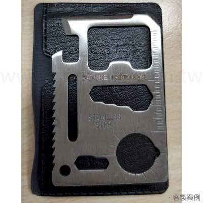 贈黑皮套 尺寸:6.7x4.5x0.15cm 材質:420優質不鏽鋼 包裝:盒裝 產品說明: 420優質不鏽鋼整體,做工精緻,正反面均光亮平整,決無毛邊,外貿出口產品,配圖紙說明,刀刃鋒利,鋼體堅固,鋸齒更是在薄薄的卡片上採用雙排交錯齒。 如此小巧實用的救生卡,在錢夾裝一個或者在鑰匙環上掛一個,不管是居家過日子還是旅遊,釣魚,野營,都如同隨時攜帶了一個簡易的工具箱,你不想嘗試一下嗎? ※LOGO客製方式:軍刀卡-雷雕/皮套-燙金 ※客製尺寸:雷雕約2.5x0.3cm、燙金約5x3cm