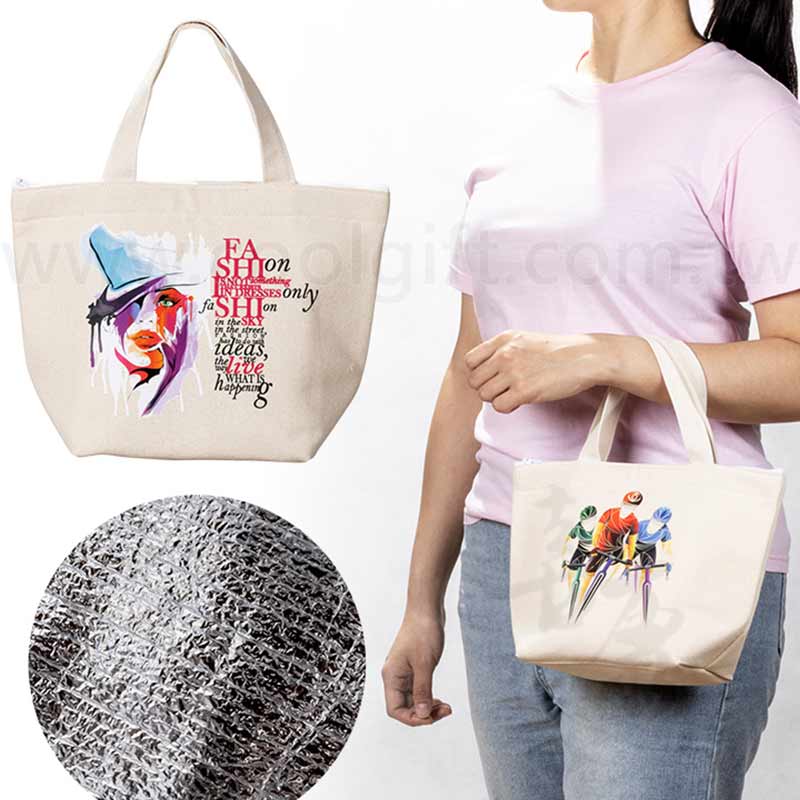 1.帆布單片式3面款式(梯形袋),便當袋,內裡2mm厚保溫鋁膜,開口拉鍊。