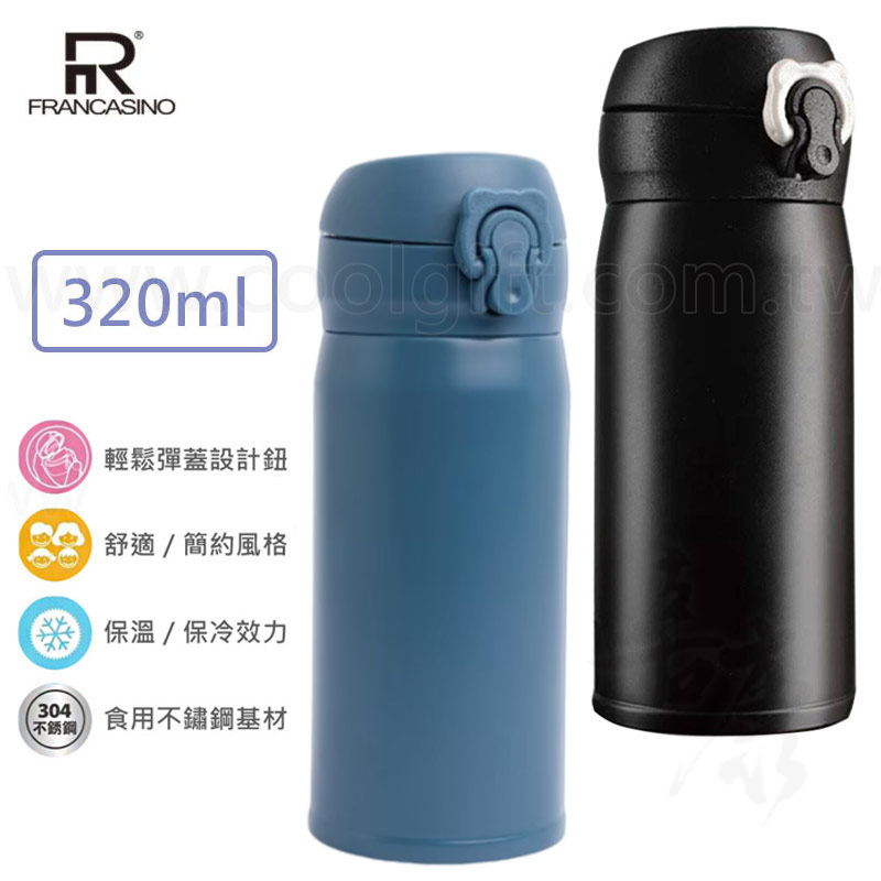 材質:內膽-304 不鏽鋼、外殼-不鏽鋼烤漆、上蓋-PP+ 矽膠 顏色:黑、藍 容量: 320ml±5% 保溫效力:4小時65°C±5% 特色: 1.真空斷熱304不鏽鋼,保溫保冷 2.真空瓶身,盛裝冰飲外殼不冒汗 3.亮麗時尚外型,居家辦公外出皆適合 4.彈跳上蓋 ONE TOUCH ,一按即飲 5.安全鎖設計不擔心誤觸漏水 6.產品通過SGS無毒檢驗合格