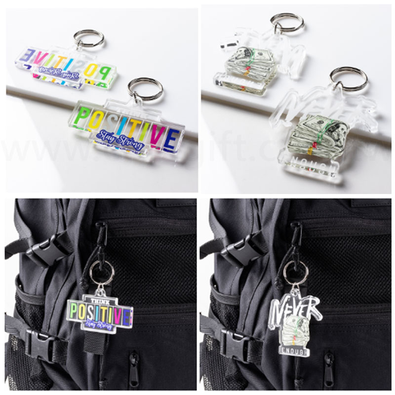 由5mm透明壓克力製成的鑰匙圈,可以雷射切割和全彩數位直噴正反兩面同圖的印刷方式,呈現出您所設計的圖像、商標,面積7 x 7cm或49cm²以內價格都相同。