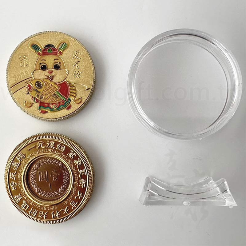 尺寸:金幣約4.5x4.5cm/絨布袋約8x11cm 包裝:絨布袋 產地:台灣製造 ※金幣及底座可以分開 ※LOGO客製方式:客製化LOGO金箔貼於紅絨布袋的另一面