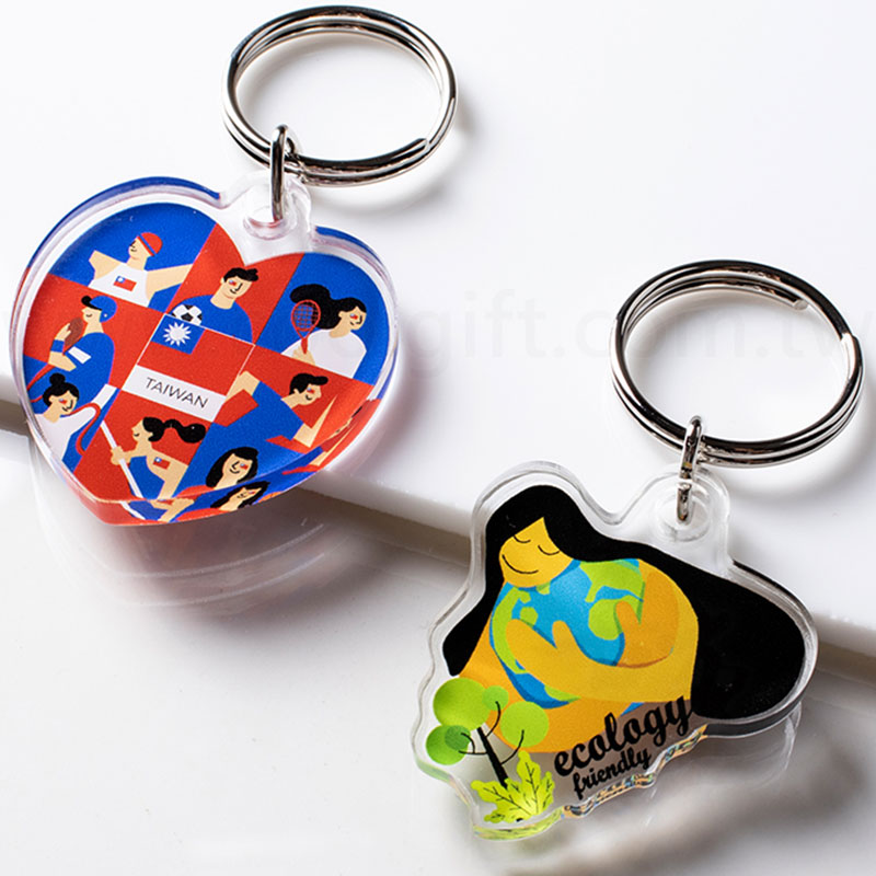 由5mm透明壓克力製成的鑰匙圈,可以雷射切割和全彩數位直噴,呈現出您所設計的圖像、商標,面積4 x 4cm或16cm²以內價格都相同。