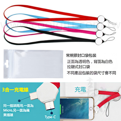尺寸:線長900x寬12mm 材質:ABS、滌綸 功能:充電、掛繩 適用充電頭:Micro USB、iPhone、Type-C *安卓、蘋果為一頭雙用 顏色:黑/白/藍/綠/橙/紅/玫紅 標準/最大電流:1.5A/2A 包裝:白色封口袋