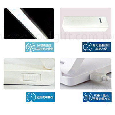 機體尺寸:430 x 43 x 35 mm 包裝尺寸:110x40x210mm 重量:140g 電源:USB / 四顆4號電池供電 額定輸入電壓:DC5V 額定輸入電流:500mAh 消耗功率:1.3W 特色: 1.可折疊,體積輕巧,攜帶方便。 2.採用最新LED技術,無幅射,無紫外線。 3.內建16顆高亮度LED自然光燈泡,光線柔和。 4.多種照明角度選擇,光源自然,無閃爍,不傷眼。 5.可選擇電池或電腦USB供電,讓您隨處都可使用。 6.放置桌上當抬燈,床邊閱讀,露營烤肉,維修照明均可。