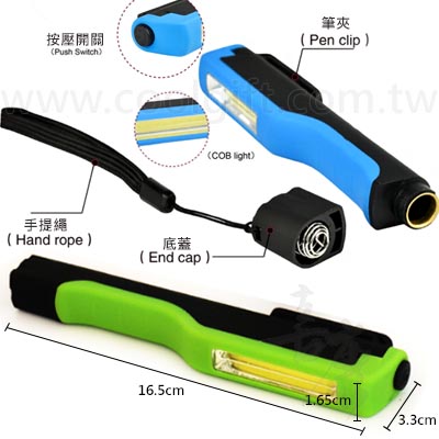 尺寸:約16.5x3.3x1.65cm 燈泡:COB 材質:ABS 特色: 緊急照明、打獵照明、野外求生探險照明、露營照明、戶外照明、防身應急