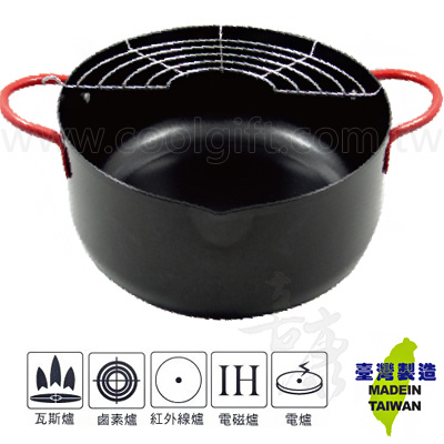 規格:長29x高8.5x寬22cm(含把手尺寸) 材質:鍋身-碳銅+素樹酯 重量:420g±5% 特色: 1.台灣製造 2.適用於炸物、炸天婦羅、清蒸、煮湯等 3.附瀝油網,省油、省時置放便利 4.傾倒嘴設計,倒油皆便利