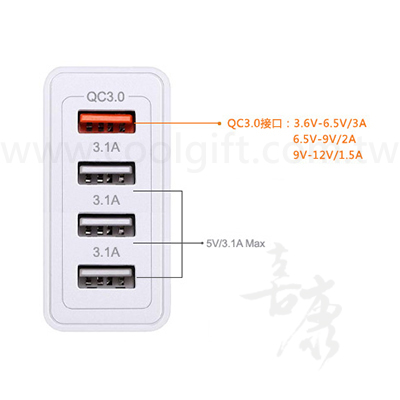 輸出電壓:QC3.0 DC 3.6-6.5V:3.0A,6.5V-9V:2A,12V:1.5A