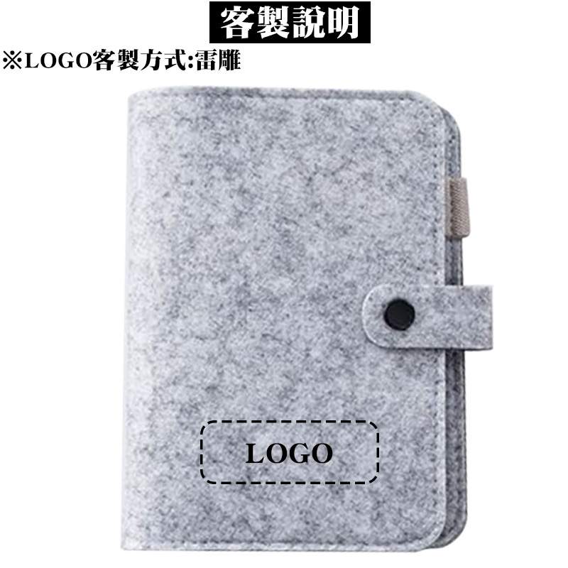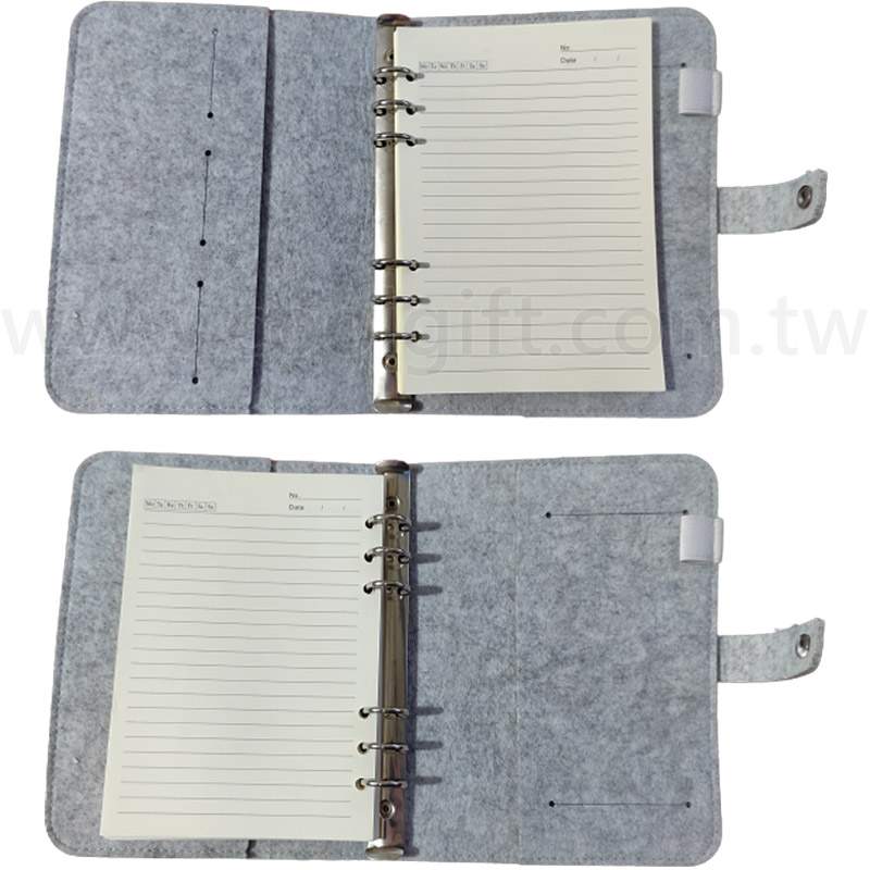 尺寸:約W19xH23cm 裝釘:6孔活頁 內頁:橫線筆記100張 材質:毛氈布 包裝:OPP袋 特色: 1.精緻按扣,簡約大方 2.附筆插彈性大,方便攜帶書寫 3.多層分隔設計,可放卡片/名片/資料/便條紙等 4.6孔活頁設計,可再依照需求自行補充內頁 ※LOGO客製方式:雷雕/印刷 ※雷雕尺寸:約W7xH4cm