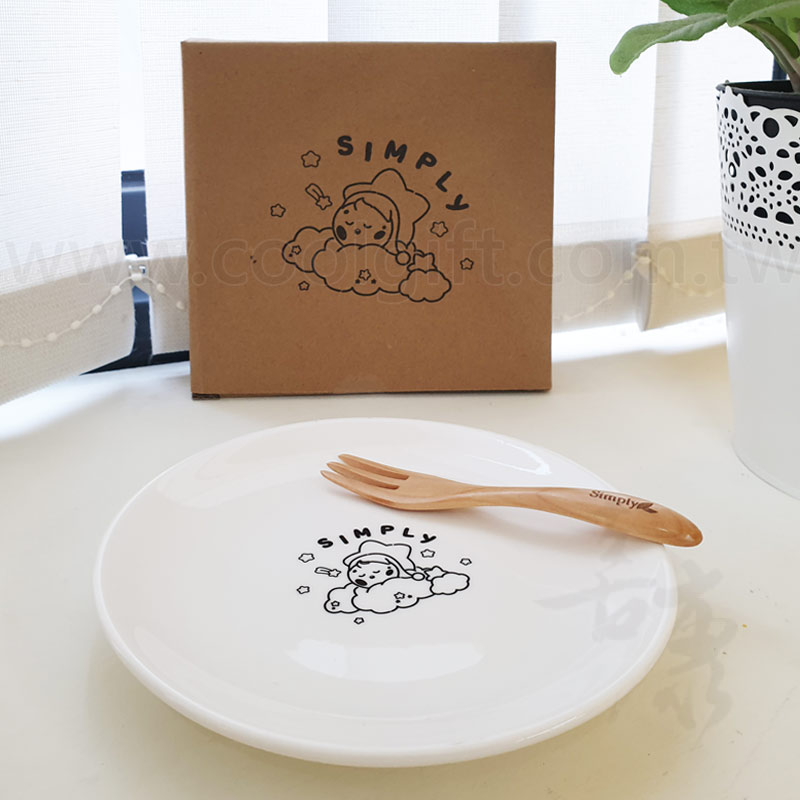 材質:圓盤-新骨瓷;木叉-荷木 尺寸:圓盤約6吋;木叉約12.5x2cm 耐熱溫度:圓盤約10℃-110℃;木叉約0℃-100℃ 包裝:客製牛皮盒 ※產品上圖文標章僅供參考若欲使用須取得授權。 ※LOGO客製方式:圓盤-烤花工藝;木叉-雷雕