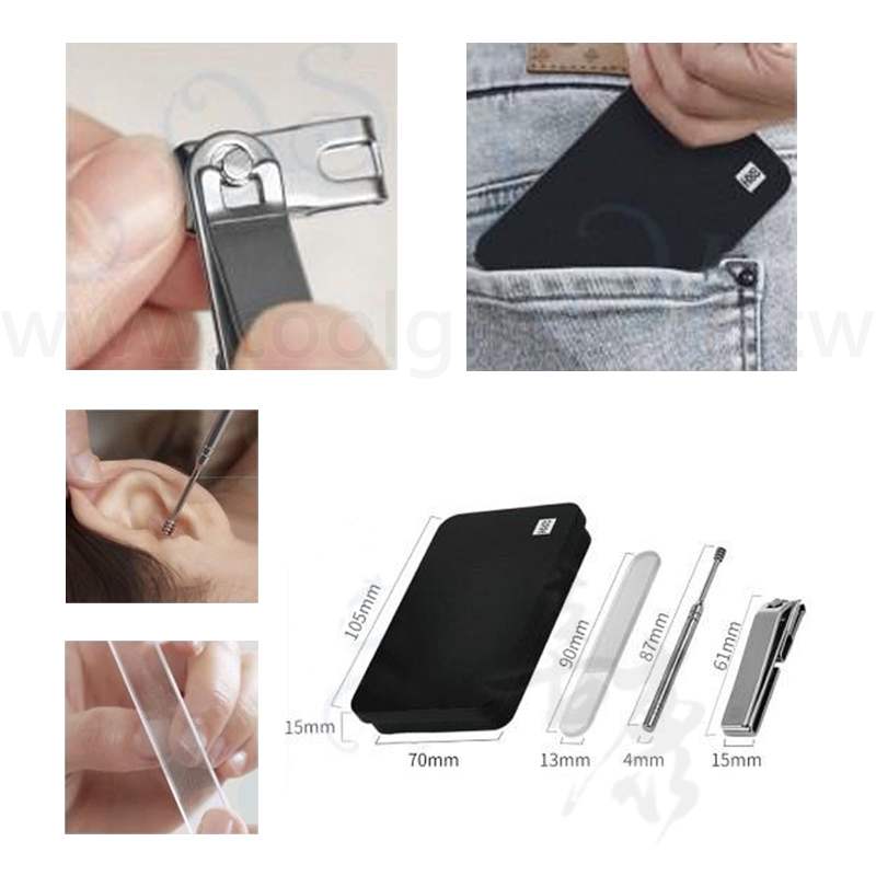 產品尺寸: 指甲刀-61x12x15mm 指甲銼-90x13x3mm 耳挖-4x87mm 收納盒-105x70x15mm 產品材質: 指甲刀-420J2不鏽鋼 指甲銼-有機玻璃 耳挖-430不鏽鋼 收納盒-鐵盒 產品特色: 1.指甲刀可旋轉鉗頭,剪甲順手更舒適 2.防飛濺結構設計,甲屑清掃更省心 3.透明玻璃銼,磨甲看的見 4.耳挖360°環形挖頭設計,全方位輕鬆掏耳 5.小巧收納盒,隨身攜帶無負擔