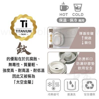 尺寸:約7.7x6.6x23cm±3% 容量:約500ml±3% 材質、耐熱: 杯身內層-SUS304不鏽鋼 杯蓋-聚丙烯PP、約120℃ 止水圈-矽膠、約120℃ 顏色:鋼鐵灰、霧灰白 特性: 1.杯身採SUS304不鏽鋼鍍鈦內層,以高科技超真空斷熱技術製作,具保溫、保冷雙重用途 2.鍍鈦內層-不沾色、不卡味 3.彈蓋按鍵鎖扣設計,方便置於包內 4.經SGS檢驗,品質保證