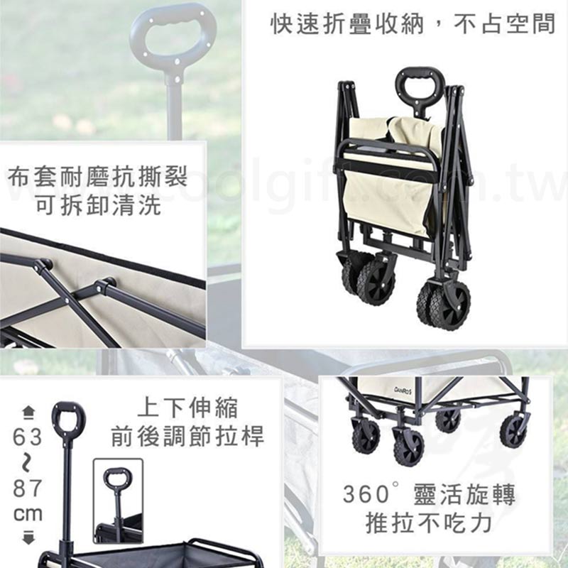 尺寸:約60x40xH43cm±3% 伸縮拉桿高-約63-87cm±3% 承重:約60公斤±3% 材質: 車身布套-600D牛津布 車架-碳鋼 車輪、拉桿-PVC塑料 顏色:白、黑 包裝:彩盒 特性: 1.布套耐磨抗撕裂,可拆卸清洗 2.快速摺疊收納,不占空間 3.上下伸縮63-87cm,前後調節拉桿 4.輪子360度靈活旋轉,推拉不吃力