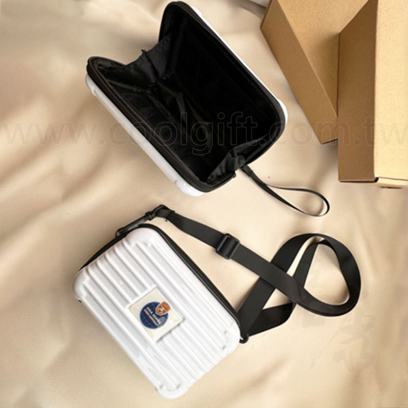 白色迷你行李箱造型的化妝包,附有可調節的肩帶,是女性出門旅行的必備小物