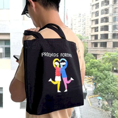 尺寸:長34cm x 高29cm x 底寬8cm (因材料縮率以及人工車縫,成品尺寸誤差正負5-8% 為正常範圍) 材質:黑色帆布12盎司 包裝:散裝,每20個入一塑膠袋 特色:採用內包邊工藝,使內部更加精緻,無線頭設計提升整體質感。 ※LOGO客製方式:全彩燙印 ※印刷尺寸:約17x17cm