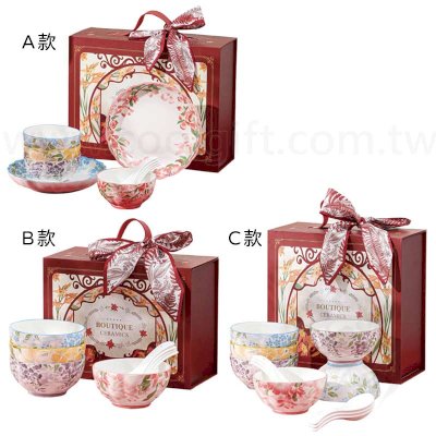 規格: 盤子-約直徑20.8cm+5% 碗-約高6.2cm+5%;碗口-約直徑12cm+5% 湯匙-約長度14cm+5% 內容物: A款-碗x4、湯匙x4、盤子x2 B款-碗x4、湯匙x4 C款-碗x6、湯匙x6 禮盒顏色:紅